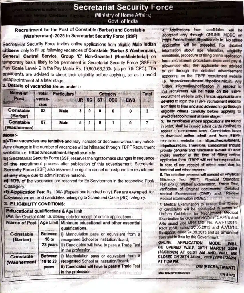 SSF Tradesman Recruitment 2026 is expected to open a significant number of vacancies for skilled and semi-skilled candidates seeking a secure central government job. The Secretariat Security Force operates under the Ministry of Home Affairs and plays a crucial role in safeguarding vital government offices, secretariat buildings, and sensitive installations across India. Recruitment for tradesman posts focuses on candidates who possess practical trade skills along with basic educational qualifications. This opportunity is especially suitable for individuals who want a stable career with good salary, allowances, pension benefits, and long-term job security